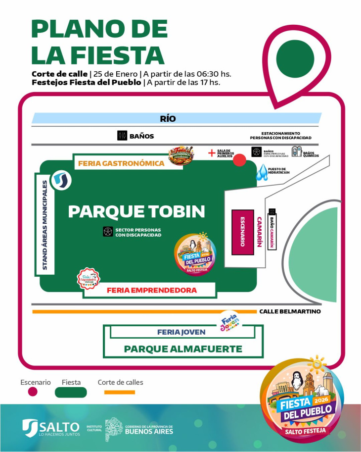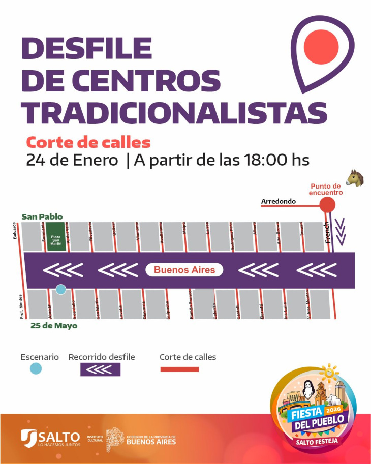 Este fin de semana se desarrollarán los Festejos Patronales de nuestra ciudad. En ese sentido, con el objetivo de facilitar la participación y el disfrute de vecinos y visitantes, la Municipalidad de Salto dio a conocer la organización general; el cronograma incluye el tradicional desfile de centros tradicionalistas en la Plaza San Martín y los festejos centrales en el Parque Tobin, junto con cortes de calles y recomendaciones para planificar la llegada y salida del evento.