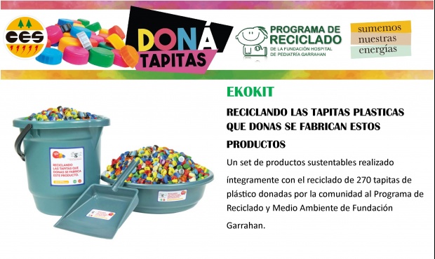 Un set de productos sustentables realizado íntegramente con el reciclado de 270 tapitas de plástico donadas por la comunidad al Programa de Reciclado y Medio Ambiente de Fundación Garrahan.